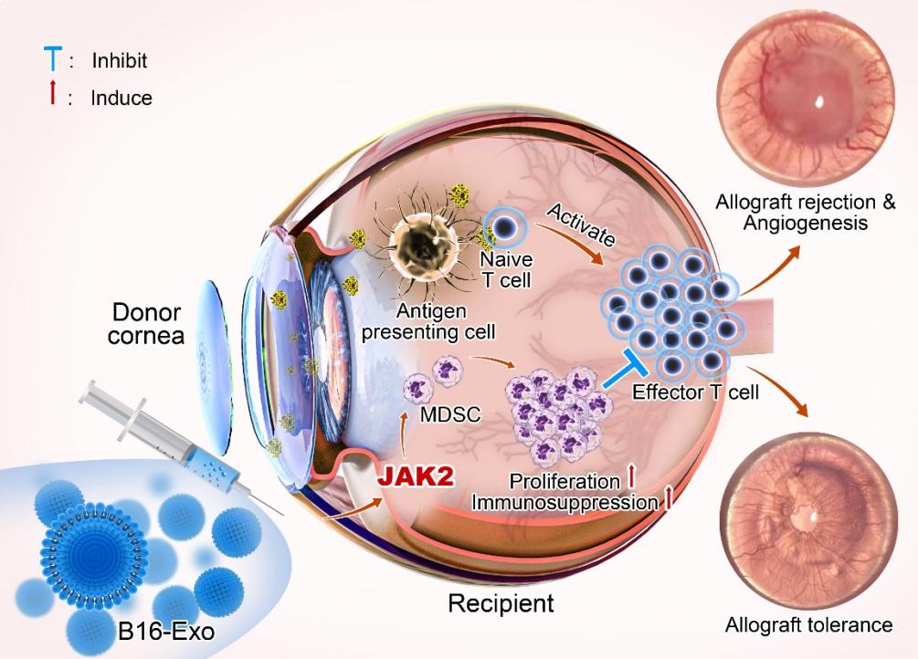 角膜移植是治疗多种角膜疾病的重要手段,但移植后免疫排斥反应是制约移植成功的主要障碍之一。研究团队发现,源自B16-F10黑色素瘤细胞的外泌体(B16-Exo)能够显著降低移植后的免疫排斥,具体表现为减少角膜不透明度和新生血管的形成,同时改善免疫失调状态。通过蛋白质组学分析,研究揭示了B16-Exo中关键蛋白的差异表达情况,特别是JAK2蛋白的作用。进一步研究表明,这些外泌体通过调控JAK2蛋白,增强了骨髓来源抑制细胞(MDSCs)的功能,从而抑制T细胞的过度增殖,展现出卓越的免疫调节能力。