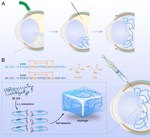 李芸团队、史俊峰团队研制出一种可注射的新型自组装肽水凝胶(3E-OX)。这种水凝胶材料以多肽链自组装为核心技术,避免了传统材料易引发的免疫反应,不仅具有接近天然玻璃体的光学性能,还具备良好的生物相容性、物质交换能力和结构稳定性。为验证3E-OX水凝胶的安全性和有效性,研究团队在新西兰白兔模型上进行了实验。研究发现,3E-OX水凝胶可通过注射的方式进入实验兔眼内,在剪切力作用下从凝胶转为液体,迅速填充玻璃体腔,而后又在玻璃体腔内转为凝胶状态支撑视网膜,又无需患者长时间保持俯卧位。在为期30天的随访中,3E-OX水凝胶表现出优异的生物相容性,且可在眼内缓慢无害化降解,无需再次手术取出,极大地减少了患者的手术负担。此外,3E-OX具备良好的代谢交换性,有助于维持眼内微环境的平衡,为后期的眼内载药、药物释放研究提供可能性。