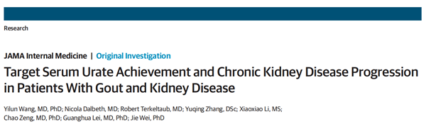 近日,中南大学湘雅医院骨科/老年骨关节疾病防治教育部重点实验室/国家老年疾病临床医学研究中心雷光华/魏捷/曾超教授团队,在临床医学大子刊《JAMA Internal Medicine》(IF 22.5)以原创论著形式在线发表题为“Target Serum Urate Achievement and Chronic Kidney Disease Progression in Patients With Gout and Kidney Disease(痛风合并肾病患者中血尿酸达标治疗与慢性肾病进展的关联)”的临床研究原创成果。