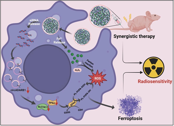 鼻咽癌是中国南方地区最常见的头颈部恶性肿瘤,每年全世界约一半的鼻咽癌患者在中国确诊,放射治疗是鼻咽癌临床首选方案,放疗抵抗机制及放疗增敏方案一直是鼻咽癌基础和临床研究领域重要的科学问题。本文发现一个环状RNA分子circADARB1在鼻咽癌组织中表达显著上调,并与患者不良预后密切相关;体内外实验证实circADARB1通过抑制铁死亡从而诱导鼻咽癌细胞对放疗的耐受。基于这些发现,该团队合成了一种由细胞膜包裹的半导体聚合物纳米材料,用于同时递送铁离子和靶向抑制circADARB1表达的siRNAs序列,协同诱导细胞铁死亡,增强了鼻咽癌放疗敏感性。