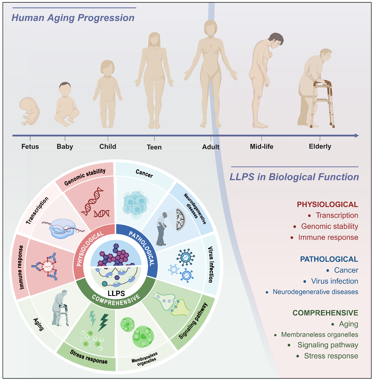 衰老,这一自然生物过程,伴随着人体正常生物功能的逐渐衰减,在细胞层面,这种功能的维持和复杂生化反应的协调,高度依赖于细胞内各种复杂组织的结构区室。这些区室,包括有膜细胞器以及Cajal小体这样的无膜结构,他们在细胞功能维持中发挥着关键作用。液-液相分离(LLPS)作为一种可逆过程,通过生物分子的自组装,介导了细胞内无膜区室的形成。这一过程不仅揭示了生物分子如何在细胞内空间中进行有序排列,还暗示了其在多种生理和病理过程中的潜在作用,其中就包括衰老。然而,尽管LLPS与衰老之间存在一定的联系,但两者之间的具体关系尚未完全阐明。近期在衰老研究领域的最新进展引入了新的定义,总结了衰老的十二个标志。通过深入探讨LLPS介导形成的无膜区室在衰老的十二个标志中的作用和机制,本文系统回顾了LLPS与衰老之间的相互作用,旨在为衰老的发生机制及相关治疗提供新的见解。