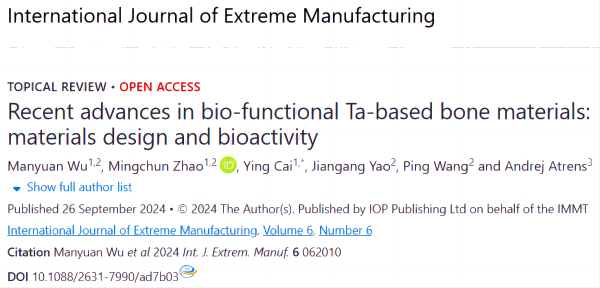 在国际高水平著名期刊《International Journal of Extreme Manufacturing》(极端制造)(Q1,IF=16.1)发表了题为《Recent advances in bio-functional Ta-based bone materials: materials design and bioactivity》(生物功能钽基骨材料的最新进展:材料设计与生物活性)的综述论文。该综述论文全面论述了多孔钽(pTa)骨材料在植入物开发中的最新进展,详细介绍了制造pTa植入物时探索的多种设计,包括基于表面形态、孔隙结构、合金化和功能化改性的优化方案。同时,综述还探讨了pTa植入物的体外细胞生物活性、体内动物成骨效果、临床应用及未来挑战。文章从康复医生的角度提出了材料设计中的关键要素,如骨缺损部位的复杂性、解剖位置,以及预期的康复效果。