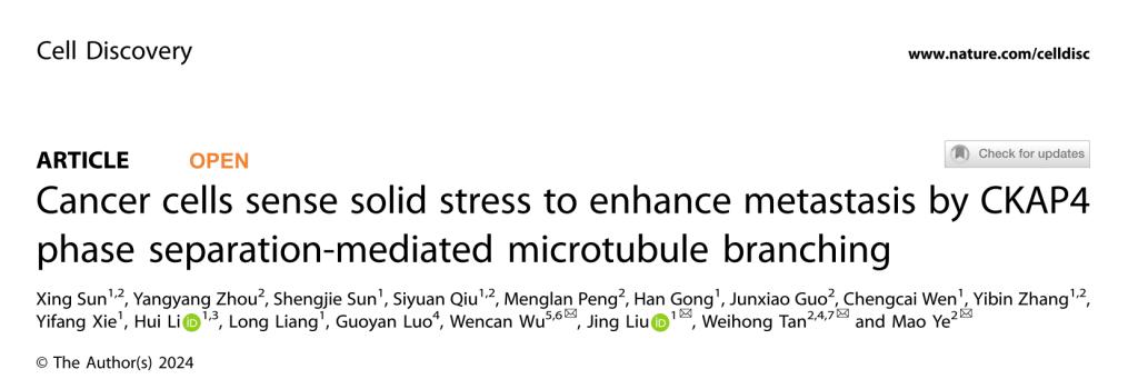 近日,中南大学湘雅二医院刘静教授团队联合在《细胞发现》(Cell Discovery)(IF:13)在线发表了题为“癌细胞感受固相应力通过CKAP4相分离介导的微管分支促进转移(Cancer cells sense solid stress to enhance metastasis by CKAP4 phase separation-mediated microtubule branching)”的研究论文。该研究首次发现细胞骨架相关蛋白4(CKAP4)作为一种敏感的细胞内机械感受器,能通过液-液相分离特异性地响应肿瘤微环境中的固相应力,调控微管的弯曲度和分支,增强肿瘤细胞的运动能力,促进其体内的转移。