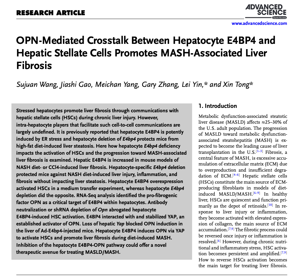 近日,中南大学湘雅二医院王素娟、高佳师、杨美婵博士在Advanced Science(14.3)杂志发表了题为“OPN-Mediated Crosstalk Between Hepatocyte E4BP4 and Hepatic Stellate Cells Promotes MASH-Associated Liver Fibrosis”的研究论文。
