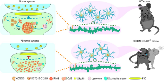 近日,中南大学袁玲教授与中科院遗传发育所许执恒研究员团队合作,以直投方式在期刊美国科学院院刊(PNAS)上发表了题为KCTD10 p.C124W变异通过减弱LLPS介导的突触形成促进精神分裂症的发生(KCTD10 p.C124W variant contributes to schizophrenia by attenuating LLPS-mediated synapse formation)的原创性研究成果,该研究揭示了KCTD10C124W杂合突变导致小鼠突触形成和/或维持缺陷以及典型的精神分裂症样行为,并与KCTD10的液-液相分离(LLPS)能力受损和RHOB降解障碍有关。