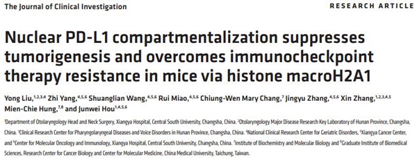 近日,中南大学湘雅医院耳鼻咽喉头颈外科张欣教授、侯军委研究员联合中国医药大学(中国台湾)洪明奇院士在国际权威期刊《Journal of Clinical Investigation》(《临床研究杂志》)发表题为《Nuclear PD-L1 compartmentalization suppresses tumorigenesis and overcomes immunocheckpoint therapy resistance in mice via histone macroH2A1 》(《核PD-L1通过组蛋白macroH2A1抑制小鼠肿瘤发生并克服免疫检查点治疗耐药性》)的原创性研究。该研究团队通过筛选,发现硫辛酸(Lipoic Acid,LA)能够有效诱导PD-L1核富集并显著增敏了PD-L1/PD-1抗体的疗效,为肿瘤免疫治疗提供了潜在的新策略。