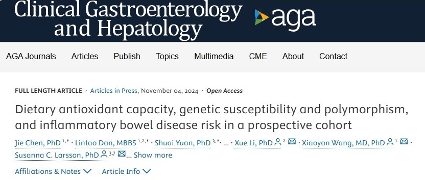 近日,中南大学湘雅三医院消化内科王晓艳教授/陈杰特聘副教授团队在消化病学中国科学院一区Top期刊《临床胃肠病学和肝病学》(Clinical Gastroenterology and Hepatology,IF 11.6) 发表原创性论著《饮食总抗氧化力对IBD发病风险的影响:结合遗传易感性和基因多态性的前瞻性队列研究(Dietary antioxidant capacity, genetic susceptibility and polymorphism, and inflammatory bowel disease risk in a prospective cohort )》,首次揭示了饮食总抗氧化力水平对炎症性肠病 (IBD) 发病的保护作用,并通过饮食-基因交互阐明了抗氧化还原酶基因多态性对于实现饮食精准防治IBD的重要指导意义。