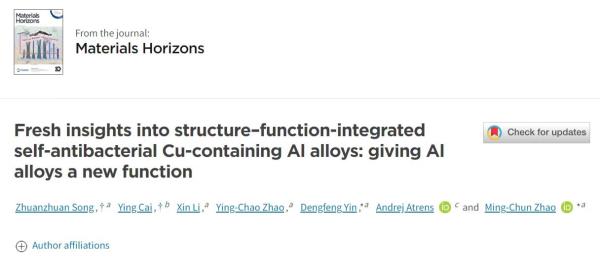 近日,由中南大学湘雅医院康复科蔡颖教授和中南大学材料学院赵明纯教授牵头组建的医工结合团队取得了新进展:在国际高水平著名期刊《Materials Horizons》(材料地平线)(Q1,IF=12.2)发表了题为《Fresh insights into structure–function-integrated self-antibacterial Cu-containing Al alloys: giving Al alloys a new function》(对结构-功能一体化的自抗菌含铜铝合金的全新见解:赋予铝合金一种新的功能)的原创性研究论文,自主研发出了自抗菌的铝合金材料。赋予铝合金抗菌功能,这在全世界尚属首次,为铝合金在临床和康复领域的应用开辟了更广阔的前景。