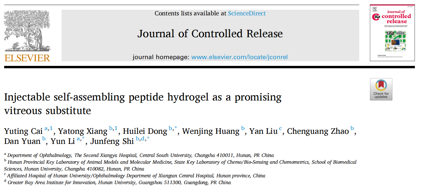 近日,中南大学湘雅二医院眼科李芸教授团队联合湖南大学生命医学交叉研究院史俊峰教授团队通过研发一种可注射式新型自组装肽水凝胶(3E-OX)为解决传统玻璃体替代物的局限,提升患者术后生活质量带来新希望。相关成果以“Injectable self-assembling peptide hydrogel as a promising vitreous substitute”为题发表于Journal of Controlled Release杂志(JCR Q1区, IF = 10.5)。