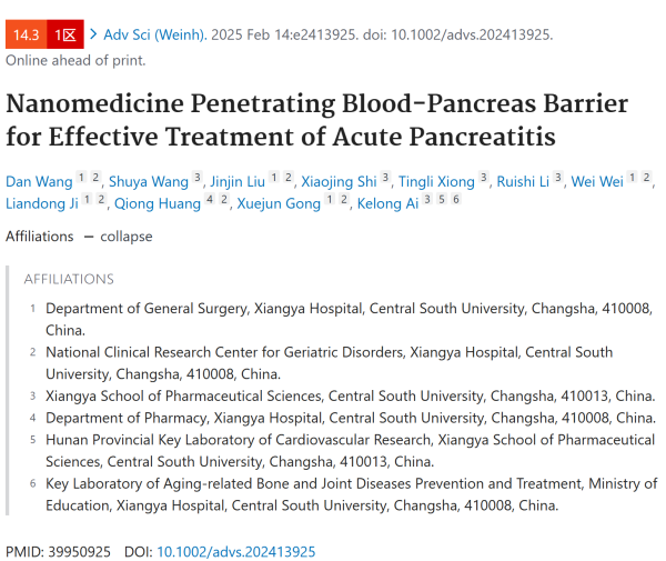 龚学军团队在国际期刊《Advanced Science》发表急性胰腺炎精准治疗新成果