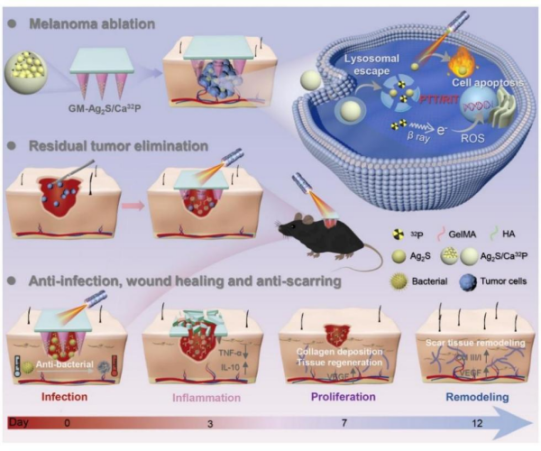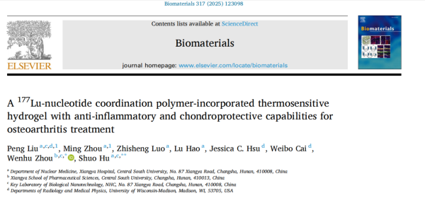 近期,中南大学湘雅医院核医学科(PET中心)/国家卫健委纳米生物技术重点实验室主任胡硕教授团队分别在《Advanced Science》(先进科学)杂志(中科院1区Top期刊,IF=14.3)和《Biomaterials》(生物材料)(中科院1区Top期刊,IF=12.8)发表题为《Biomineralized Nanocomposite-Integrated Microneedle Patch for Combined Brachytherapy and Photothermal Therapy in Postoperative Melanoma Recurrence and Infectious Wound Healing》(生物矿化纳米复合材料集成微针贴片联合近距离放射治疗与光热疗法用于术后黑色素瘤复发及感染性伤口愈合研究)和《A 177Lu-nucleotide Coordination Polymer-incorporated Thermosensitive Hydrogel with Anti-inflammatory and Chondroprotective Capabilities for Osteoarthritis Treatment》(具有抗炎和软骨保护功能的177Lu-核苷酸配位聚合物温敏凝胶用于骨关节炎治疗)的原创性研究。