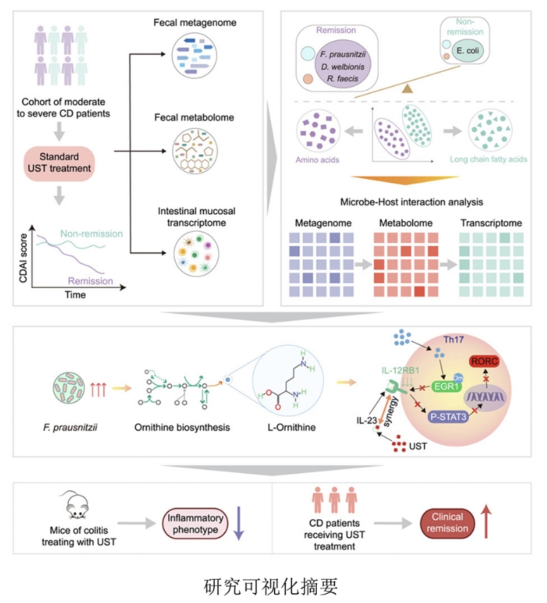 近期,中南大学湘雅三医院消化内科王晓艳教授团队联合上海交通大学仁济医院洪洁教授团队在国际顶级期刊《细胞代谢(Cell Metabolism,IF=27.7)》上发表了题为“肠道菌群来源的L-鸟氨酸在增强乌司奴单抗治疗克罗恩病疗效中的协同作用(Synergistic Role of Gut Microbiota-Derived L-Ornithine in Enhancing Ustekinumab Efficacy for Crohn’s Disease)”的研究论文,揭示L-鸟氨酸增强乌司奴单抗(ustekinumab)治疗克罗恩病疗效的协同作用及机制。