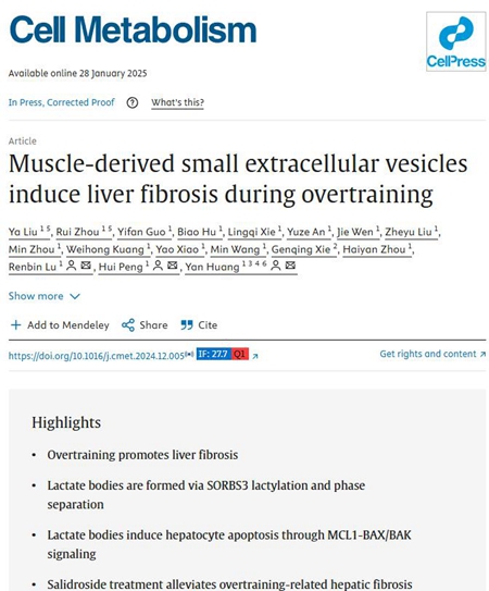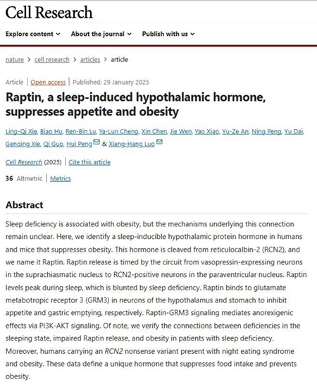 近日,中南大学湘雅医院内分泌科主任、内分泌研究中心主任罗湘杭教授团队以论著形式分别在国际著名期刊《Cell Research》(细胞研究,IF=28.2)在线发表题为“Raptin, a sleep-induced hypothalamic hormone, suppresses appetite and obesity”(Raptin是一种睡眠诱导的下丘脑激素,能抑制食欲和肥胖)和《Cell Metabolism》(细胞代谢,IF=27.7)在线发表题为“Muscle-derived small extracellular vesicles induce liver fibrosis during overtraining”(过度训练肌源性细胞外小囊泡诱导肝纤维化)的最新研究成果。《Raptin, a sleep-induced hypothalamic hormone, suppresses appetite and obesity》显示,该研究发现了一种睡眠诱导的下丘脑激素Raptin,该激素可以抑制食欲和肥胖,从而为肥胖治疗提供了潜在新途径。《Muscle-derived small extracellular vesicles induce liver fibrosis during overtraining》显示,该研究发现了过度运动可以通过肌肉来源的sEV促进肝脏纤维化。