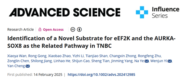 近日,中南大学湘雅二医院药学部程岩教授课题组,乳腺外科易文君教授课题组以及苏州大学药学院叶娜教授课题组合作,在国际权威学术期刊《高级科学》(Advanced Science)(中科院一区top,IF=14.3)在线发表了题为《鉴定新的eEF2K底物以及AURKA-SOX8作为三阴性乳腺癌的调控通路》(Identification of a novel substrate for eEF2K and the AURKA-SOX8 as the related pathway in TNBC)的研究性论文,该研究发现eEF2K是促进三阴性乳腺癌(TNBC)进展的关键调节因子,并揭示 AURKA是eEF2K的磷酸化底物。研究表明,eEF2K通过AURKA/SOX8信号轴促进三阴性乳腺癌的恶性进展。此外,研究人员通过对先导化合物C1进行结构改造,成功开发出新的eEF2K小分子降解剂C4,其表现出更强的抗TNBC活性。