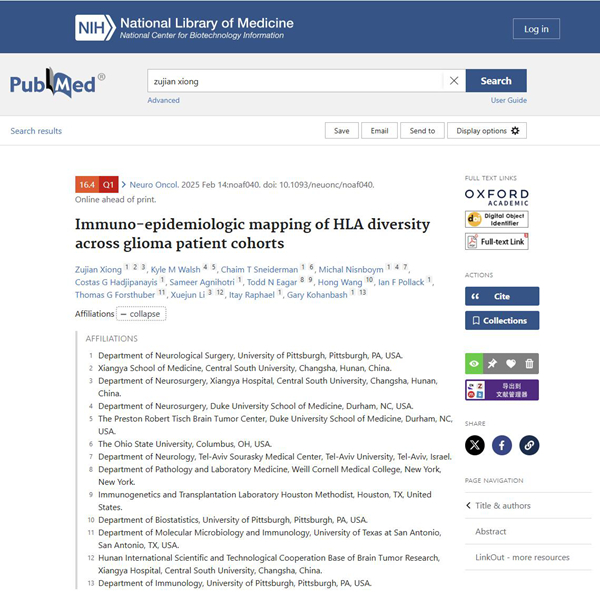 近日,中南大学湘雅医院临床医学八年制2014级学生、湘雅医院神经外科李学军教授团队博士研究生熊祖剑,以独立第一作者身份在神经肿瘤学领域权威期刊《Neuro-Oncology》(《神经肿瘤学》,中科院一区Top期刊,影响因子:16.4)在线发表了题为“Immuno-epidemiologic mapping of HLA diversity across glioma patient cohorts”(跨胶质瘤患者群体的HLA多样性免疫流行病学图谱)的研究论文。研究结果表明,某些HLA等位基因在特定种族中显著富集,且与神经胶质瘤的发病风险和患者预后密切相关。这一发现为理解神经胶质瘤的免疫逃逸机制提供了新的视角。