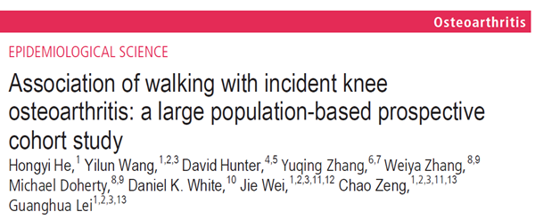 近日,中南大学湘雅医院骨科/老年骨关节疾病防治教育部重点实验室/国家老年疾病临床医学研究中心雷光华/曾超/魏捷教授团队,在骨关节炎领域顶刊《Annals of the Rheumatic Diseases(风湿病年鉴)》(IF 20.3)以“原创论著”形式在线发表题为“Association of walking with incident knee osteoarthritis: a large population-based prospective cohort study(步行与膝骨关节炎发病风险的关联:一项大规模前瞻性队列研究)”的临床研究成果。步行可分为“主动步行”和“随意步行”。主动步行是指持续、快速(≥60步/分钟)且由明确目的驱动的步行,如快走通勤、徒步锻炼等。随意步行是指间断、慢速(<60步/分钟)且在日常生活中自然发生、无明确目的和计划的步行,如随意走动、休闲逛街等。主动步行和随意步行因其活动频率和强度存在显著差异,其对膝骨关节炎的作用可能截然相反。为此,雷光华/曾超/魏捷教授团队首次探究了这两种步行方式对膝骨关节炎发病风险的可能影响。结果表明,针对未患膝骨关节炎的人群,从每日主动步行2,000步开始,随着步数增加,膝骨关节炎发病风险逐渐降低,直至达到8,000步。而每日随意步数增多不仅无益,甚至可能升高膝骨关节炎的发病风险。