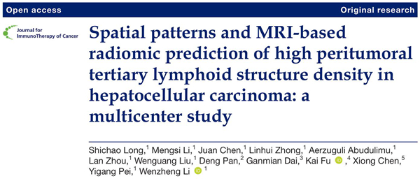近日,中南大学湘雅医院放射科李文政教授团队以原创性临床研究论著形式在BMJ杂志旗下的免疫学TOP期刊Journal for Immunotherapy of Cancer(JCR Q1, IF=10.3, 中科院一区)连续发表两篇题为“Spatial patterns and MRI-based radiomic prediction of high peritumoral tertiary lymphoid structure density in hepatocellular carcinoma: a multicenter study”(肝细胞癌瘤周高密度三级淋巴结构的空间模式和MRI放射组学预测:一项多中心研究)和“Transfer Learning radiomic model predicts intra-tumoral tertiary lymphoid structure in Hepatocellular Carcinoma: a multicenter study”(迁移放射组学模型预测肝细胞癌的瘤内三级淋巴结构:一项多中心研究)。基于湘雅医院放射科牵头的HCC多中心影像、病理和基因等多组学数据库,该研究在大样本的临床队列内评估高密度瘤周TLS与HCC患者的预后和免疫治疗响应的关系。通过结合生物信息学分析和实验验证等方法,鉴定出细胞因子CXCL9和CXCL10的共同浸润是高密度瘤周TLS形成的关键分子。随后,研究团队开发了基于磁共振影像组学模型,用于预测HCC瘤周的TLS状态,为HCC免疫治疗的疗效预测提供了新的依据。基于上述研究基础,研究团队进一步提出:TLS的空间分布规律是否会影响到HCC靶免治疗的疗效。通过多中心回顾性临床队列,运用基线多参数磁共振图像提取相关特征,构建可解释性的深度学习影像组学模型,用于无创评估瘤内TLS状态,为HCC的精准诊疗提供了新型分子标志物。