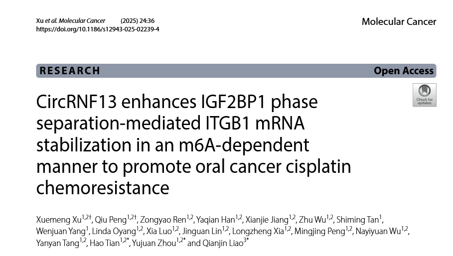 近日,由谈球吧附属肿瘤医院周钰娟教授作为共同通讯作者,该院作为第一单位在《MOLECULAR CANCER》(中科院一区,2023IF=27.7)发表了题为“CircRNF13 enhances IGF2BP1 phase separation-mediated ITGB1 mRNA stabilization in an m6A-dependent manner to promote oral cancer cisplatin chemoresistance (CircRNF13通过m6A依赖性增强IGF2BP1相分离介导的ITGB1 mRNA稳定性,促进口腔癌顺铂耐药性)”的原创性研究论文。