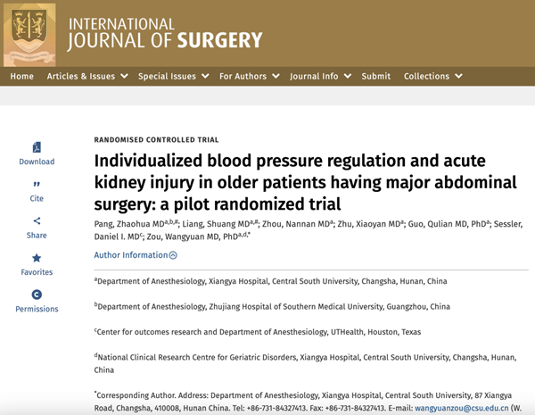 原文链接:Pang Z, Liang S, Zhou N, Zhu X, Guo Q, Sessler DI, Zou W. Individualized blood pressure regulation and acute kidney injury in older patients having major abdominal surgery: a pilot randomized trial. Int J Surg. 2025 Jan 30. doi: 10.1097/JS9.0000000000002289.