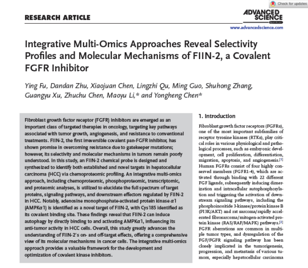 近日,中南大学湘雅医院国家卫健委肿瘤蛋白质组学重点实验室/抗癌药物国家地方联合工程实验室陈永恒教授团队,在国际权威学术期刊《Advanced Science(先进科学)》(中科院一区,IF:14.3)以原创论著形式发表了题为“Integrative Multi-Omics Approaches Reveal Selectivity Profiles and Molecular Mechanisms of FIIN-2, a Covalent FGFR Inhibitor”(综合多组学方法揭示共价FGFR抑制剂FIIN-2的选择谱和分子机制)的研究论文。该研究创新性地采用化学蛋白质组学、磷酸化蛋白质组学、蛋白质组学和转录组学多组学整合分析的方法,系统解析了FGFR共价抑制剂FIIN-2的靶点谱及分子机制。