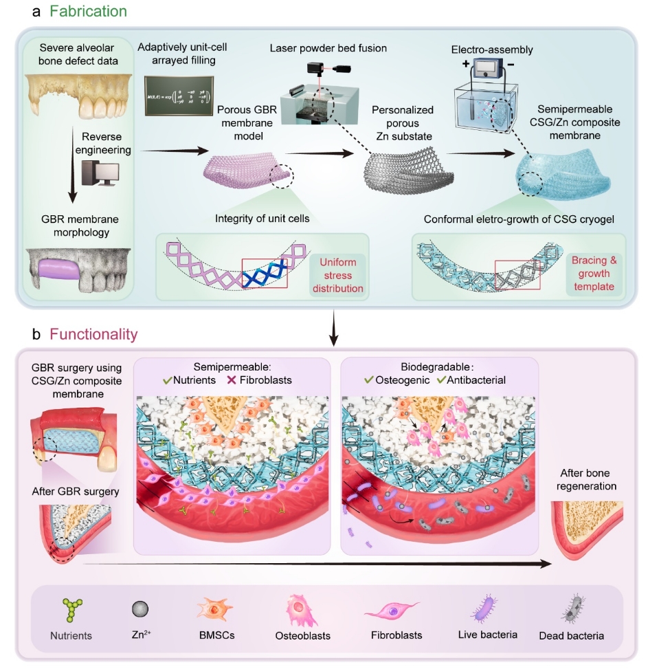 近日,芙蓉实验室医用材料与生物仿真研究部负责人、中南大学湘雅口腔医院院长、湖南省口腔数智化与个体诊疗技术工程研究中心主任刘欧胜及其带领的湘雅口腔生物智造团队在材料学经典期刊《Materials Today》(IF=21.1)上发表了“Additive Manufacturing of Personalized, Semipermeable and Biodegradable Polymer/Metal Composite Membrane for Guided Bone Regeneration(增材制造个性化、半渗透、可降解高分子/金属复合引导骨头再生膜)”的研究论文 (https://doi.org/10.1016/j.mattod.2025.01.001)。本研究探索一种基于电化学组装和激光粉末床熔融的复合增材制造方法以制备个性化、半透性和可生物降解的高分子/金属GBR膜。
