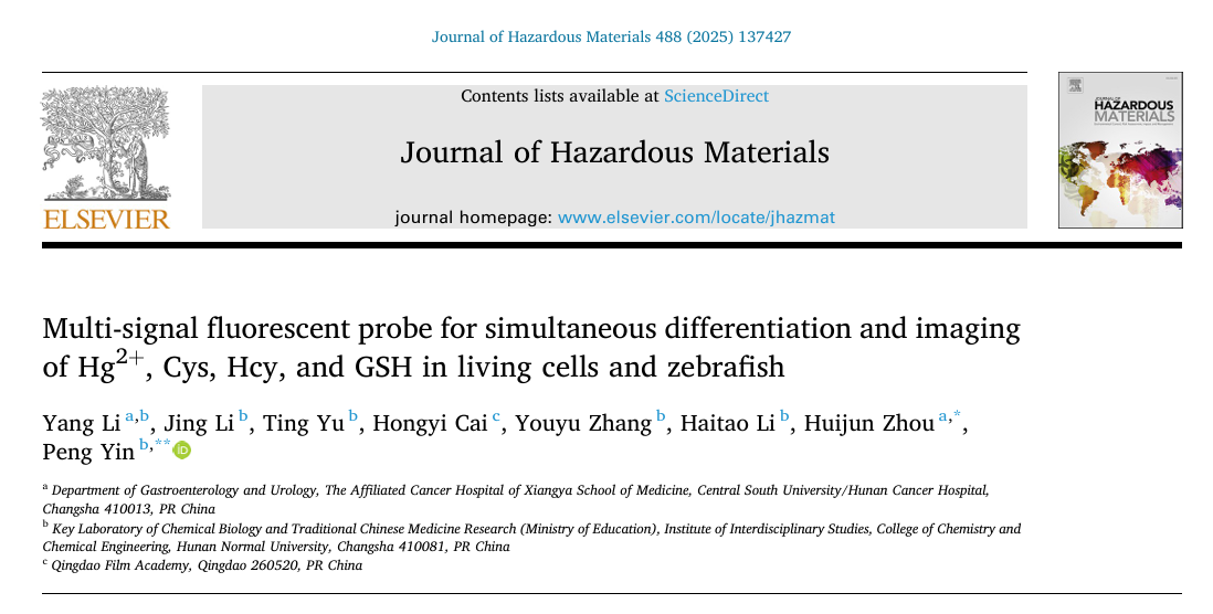 周慧俊团队和湖南师范大学尹鹏团队在《Journal of Hazardous Materials》上发表“新型多功能荧光探针成功实现活细胞和斑马鱼中Hg²⁺、Cys、Hcy和GSH的同时检测与成像”的研究成果