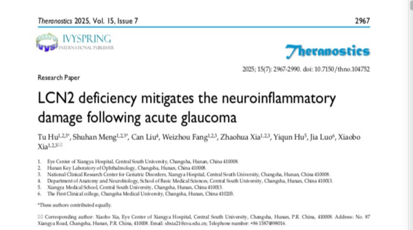 近日,中南大学湘雅医院眼科中心及眼科学湖南省重点实验室夏晓波教授团队在《Theranostics》(《诊断治疗学》中科院一区,IF:12.4)发表题为“LCN2 deficiency mitigates the neuroinflammatory damage following acute glaucoma” (LCN2的缺失可缓解急性青光眼神经炎症损伤)的研究论文。该研究揭示了脂质运载蛋白2(LCN2)在急性高眼压后视网膜屏障破坏、外周免疫细胞浸润及原位胶质免疫应答中的关键调控作用。研究发现,急性高眼压损伤初期存在以血视网膜屏障破坏、外周免疫浸润及免疫激活为特征的“神经炎症级联反应”,而抑制LCN2表达可显著缓解视网膜神经炎症反应,发挥神经保护作用。此外,研究首次发现外周血中LCN2浓度与视网膜炎症程度呈正相关,提示其作为青光眼神经炎症评估生物标志物的潜力。