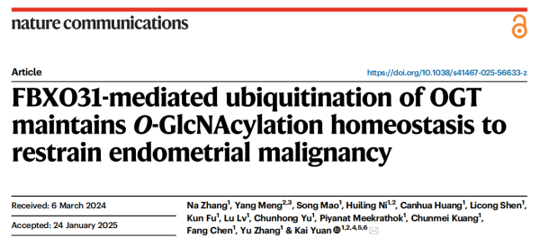 近日,中南大学湘雅医院精准分子医学研究所袁凯研究员团队与湘雅医院妇科张瑜教授团队合作,在国际知名期刊《Nature Communications》(中科院一区Top期刊,IF=14.7)上在线发表了题为“FBXO31-mediated ubiquitination of OGT maintains O-GlcNAcylation homeostasis to restrain endometrial malignancy(FBXO31介导的OGT泛素化维持O-GlcNAcylation稳态以抑制子宫内膜癌的恶性进展)”的原创性研究成果。子宫内膜癌是女性常见的恶性肿瘤,晚期子宫内膜癌的治疗更是常面临治疗手段有限的巨大挑战,深入研究其恶性进展的分子机制可为解决这一问题提供新希望。O-GlcNAcylation作为一种关键的蛋白翻译后修饰,已被发现与细胞代谢活动及癌症发展密切相关,但其在子宫内膜癌中的作用仍未完全明确。为了揭示这一机制,研究团队与临床生物样本中心及妇科张瑜教授团队密切合作,通过分析219例大型中国子宫内膜癌患者的临床队列,发现O-GlcNAcylation水平与子宫内膜癌的组织学分级、FIGO分期及患者预后存在显著相关。团队创新性地运用机器学习的方法构建了O-GlcNAc虚拟指数模型,并验证了该模型与临床参数之间的紧密关联。值得注意的是,团队成功建立了一个包含子宫内膜癌、宫颈癌、卵巢癌等妇科肿瘤及其他非妇科肿瘤的类器官库平台,极大促进了肿瘤生物学研究与临床转化的进展。利用平台中的类器官模型,研究发现O-GlcNAcylation的增加能促进患者来源的子宫内膜癌及非癌内膜上皮类器官的增殖和干细胞样特性,揭示了其在肿瘤进展中的重要作用。此外,进一步研究表明,FBXO31通过泛素化降解OGT,其缺失导致OGT积累,促进O-GlcNAcylation水平升高,从而激活致癌信号,推动肿瘤进展。研究团队还通过靶向OGT的抑制剂OSMI-1,在患者来源的子宫内膜癌类器官和小鼠模型中显著抑制了肿瘤生长,验证了这一发现的临床应用潜力。通过虚拟指数模型、类器官库平台和靶向治疗策略,本研究推动了子宫内膜癌分子机制的研究与临床转化,为精准医学提供了新的诊疗思路。