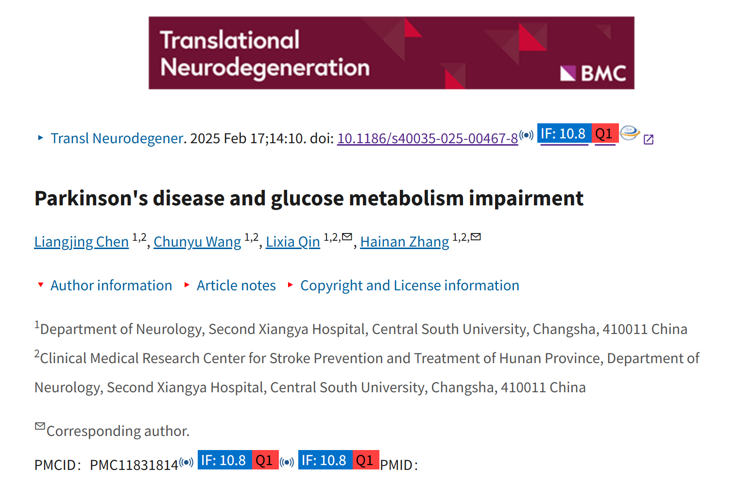 近日,中南大学湘雅二医院神经内科、湖南省脑卒中防治临床医学研究中心张海南教授、秦利霞助理研究员团队在《Translational Neurodegeneration》 (转化性神经退行性变,IF:10.8)在线发表题为“Parkinson’s disease and glucose metabolism Impairment”(帕金森病和葡萄糖代谢障碍)的新综述。帕金森病(Parkinson’s disease,PD) 是最常见的神经退行性疾病之一。PD 患者在整个疾病阶段表现出不同程度的异常葡萄糖代谢。葡萄糖代谢异常与 PD 的发病机制和进展密切相关。PD 涉及的关键葡萄糖代谢过程包括葡萄糖转运、糖酵解、三羧酸循环、氧化磷酸化、磷酸戊糖途径和糖异生。最近的研究表明,葡萄糖代谢是 PD 的潜在治疗靶点。在这篇综述中,张海南团队探讨了PD 与异常葡萄糖代谢之间的联系,重点关注潜在的病理生理机制。此外,还根据当前细胞和动物模型研究的结果总结了与葡萄糖代谢相关的潜在治疗药物。中南大学湘雅二医院神经内科硕士生陈靓婧为第一作者,张海南教授和秦利霞助理研究员为共同通讯作者。