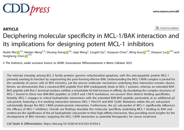 近日,中南大学湘雅医院国家卫健委肿瘤蛋白质组学重点实验室/抗癌药物国家地方联合工程实验室陈永恒教授团队与暨南大学陆小云教授团队合作,在国际权威学术期刊《Cell Death & Differentiation》(细胞死亡与分化,IF:13.7)以原创论著形式发表了题为“Deciphering molecular specificity in MCL-1/BAK interaction and its implications for designing potent MCL-1 inhibitors”(揭秘MCL-1/BAK相互作用的分子特异性及其对设计高效MCL-1小分子抑制剂的意义)的研究论文。该研究突破性地揭示了MCL-1蛋白在肿瘤细胞抗凋亡过程中的分子机制,为新一代MCL-1抑制剂的设计提供了重要理论依据。