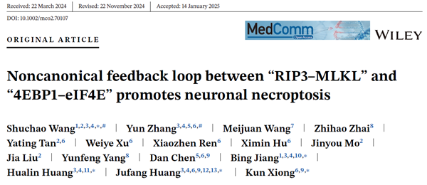 近日,湘雅二医院医学实验研究中心、眼科、麻醉科、生物样本中心、放射科、生殖中心和中南大学基础医学院人体解剖与神经生物学系团队在国际期刊《医疗通讯》(Medcomm)(JCR 1区、IF 10.7)发表题为《“RIP3-MLKL”和“4EBP1-eIF4E”非经典调控环路在神经元程序性坏死中的作用》(Noncanonical feedback loop between “RIP3-MLKL” and“4EBP1-eIF4E”promotes neuronal necroptosis)的研究论文,该研究揭示了调控神经元程序性坏死的非经典正反馈环路:“RIP3/MLKL-4EBP1-eIF4E”正反馈调控环路加剧神经与程序性坏死。