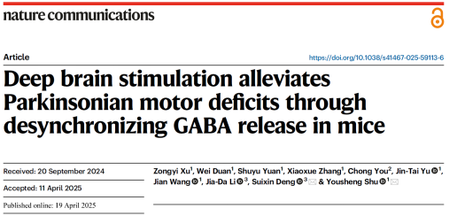 近日,复旦大学脑科学转化研究院舒友生课题组与中南大学生命科学学院邓穗馨助理教授合作,在国际学术期刊《Nature Communications》上发表了题为“Deep brain stimulation alleviates Parkinsonian motor deficits through desynchronizing GABA release in mice”的研究论文。该研究首次揭示了GABA递质的非同步化释放(Asynchronous release, AR)模式在高频DBS治疗中的关键作用,从细胞、突触及神经环路层面系统解析了STN-DBS的神经机制,为优化帕金森病临床治疗提供了新方向。