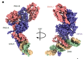 该研究团队通过整合转基因小鼠与人类缺血心肌样本的多组学数据,结合转录因子互作分析和基因编辑技术,首次揭示:在昼夜节律保护时相(ZT8,15:00),BMAL1可与非经典结合伙伴HIF2A形成功能性异源二聚体,识别并结合非经典HRE序列(CAGGTG),协同激活下游靶基因双调蛋白(AREG)的节律性转录,介导昼夜节律依赖的心肌保护作用。敲除BMAL1、HIF2A或AREG均可消除心梗的昼夜差异,确立了BMAL1–HIF2A–AREG信号轴的核心地位。研究团队进一步通过AlphaFold结构预测与冷冻电镜技术,首次解析了BMAL1/HIF2A/DNA复合体的三维结构(分辨率3.6 Å):BMAL1通过PAS蛋白结构域的构象变化实现“分子开关”功能,动态整合“昼夜节律信号”与“缺氧信号”,突破了传统认知中二者作为独立调控网络的观点,也为开发针对该蛋白结构的小分子药物提供了原子级结构蓝图。基于此,研究提出“依时给药”治疗策略:在通路活性低谷期(ZT20)给予川陈皮素(NOB)可代偿性激活BMAL1-HIF2A通路,缩小梗死面积;而在活性高峰期(ZT8)使用HIF2A激动剂vadadustat可提升射血分数、改善心功能。