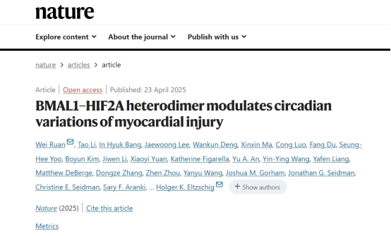 近日,中南大学湘雅二医院麻醉科阮溦副教授(第一作者和通讯作者)、美国德克萨斯大学休斯顿健康科学中心麻醉系Holger Eltzschig教授以及生化与分子生物学系Kuang-Lei Tsai助理教授共同通讯在《Nature》(IF=50.5)发表了题为《BMAL1–HIF2A heterodimer modulates circadian variations of myocardial injury》的研究论文,标志着湘雅二医院在基础与转化医学领域实现了重大突破。