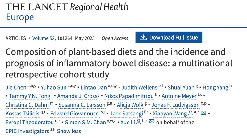 近日,中南大学湘雅三医院消化内科王晓艳教授/陈杰副教授团队携手浙江大学公共卫生学院李雪研究员团队,在国际权威期刊《Lancet Regional Health-Europe》(柳叶刀区域健康-欧洲,IF=13.6)发表原创性研究论著《Composition of plant-based diets and the incidence and prognosis of inflammatory bowel disease: a multinational retrospective cohort study》(植物性饮食与炎症性肠病的发病及预后相关性:一项多国回顾性队列研究)。该研究通过跨国超大规模队列数据,首次系统揭示了植物性饮食组成对IBD发病及预后的作用,为精准饮食干预提供了高质量证据。