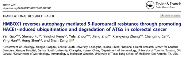 近日,中南大学湘雅医院肿瘤科曾珊、韩莹、申竑教授团队在国际知名期刊《Autophagy(自噬)》(IF:14.6,JCR Q1)上发表了题为“HMBOX1 reverses autophagy mediated 5-fluorouracil resistance through promoting HACE1-induced ubiquitination and degradation of ATG5 in colorectal cancer”(HMBOX1通过促进HACE1诱导的ATG5泛素化降解逆转自噬介导的结直肠癌5-氟尿嘧啶耐药)的原创研究性论文。该研究揭示了转录因子HMBOX1通过调控E3泛素连接酶HACE1,促进ATG5泛素化降解,从而抑制自噬,增强结直肠癌细胞对5-FU的敏感性,为克服治疗耐药提供了潜在新靶点。