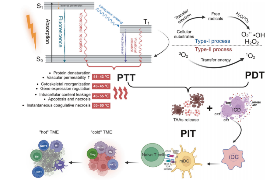 本综述全面梳理了三大主流光疗手段:光动力疗法(PDT)、光热疗法(PTT)与光免疫疗法(PIT),并构建了贯穿活性氧(ROS)生成、热致损伤与免疫激活的完整机制链条。文章深入解析了Type-I/II活性氧生成机制、表面等离子体共振效应、热诱导蛋白破坏、Gasdermin家族介导焦亡、铁离子诱导铁死亡、铜离子介导线粒体聚集死亡等多个关键路径,首次将这些碎片化机制整合入光疗介导的免疫协同激活模型中,为理解光疗系统性生物学奠定坚实基础。