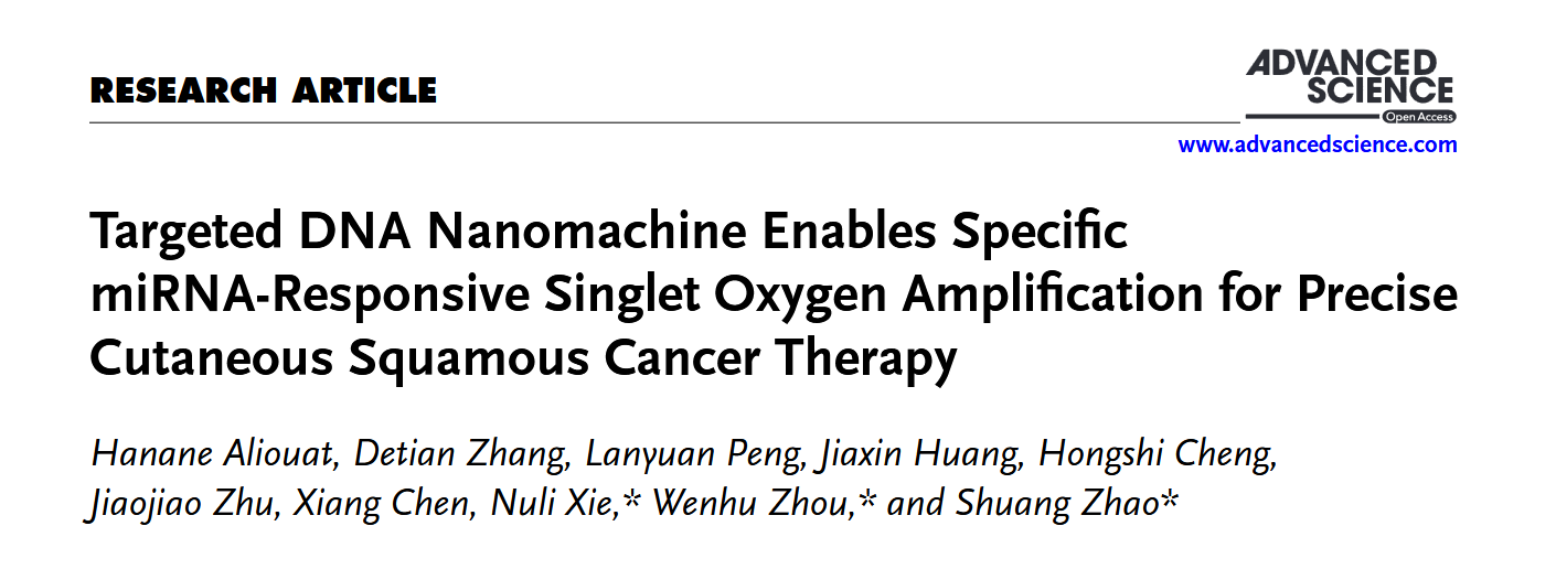 近期,中南大学湘雅药学院周文虎教授-谢努力副教授团队联合湘雅医院赵爽副研究员在国际权威期刊《Advanced Science》(中科院一区TOP期刊,影响因子14.3)以Research Article形式发表题为“Targeted DNA Nanomachine Enables Specific miRNA-Responsive Singlet Oxygen Amplification for Precise Cutaneous Squamous Cancer Therapy(特异性miRNA响应的单线态氧放大的DNA纳米机器用于皮肤鳞状细胞癌的治疗)”的原创性论文。