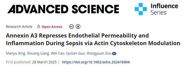 近日,中南大学湘雅医院麻醉手术部,湖南省麻醉与围术期医学临床研究中心邹望远教授团队在《Advanced Science》(先进科学, Q1,IF=14.3)以“Research Article”形式在线发表题为 “Annexin A3 Represses Endothelial Permeability and Inflammation During Sepsis via Actin Cytoskeleton Modulation”(膜联蛋白A3通过调控肌动蛋白细胞骨架抑制脓毒症的内皮通透性与炎症)脓毒症研究领域的原创研究性论文。该研究揭示了Annexin A3(ANXA3)通过稳定肌动蛋白细胞骨架,在脓毒症内皮功能障碍中发挥保护作用,为脓毒症诱发的内皮细胞功能障碍调控防治提供了潜在新靶点。