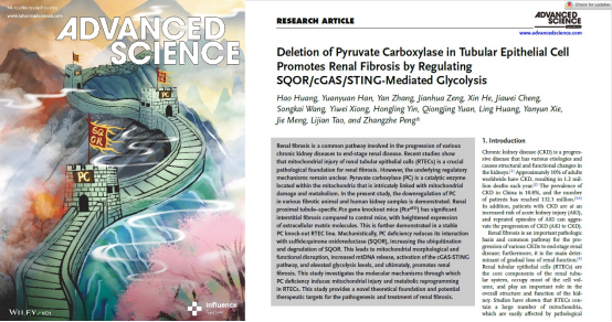 2025年4月,中南大学彭张哲/黄皓团队在《Advanced Science》(IF: 14.3,中科院一区)上发表题为“Deletion of Pyruvate Carboxylase in Tubular Epithelial Cell Promotes Renal Fibrosis by Regulating SQOR/cGAS/STING-Mediated Glycolysis”(丙酮酸羧化酶在肾小管上皮细胞中的缺失可通过SQOR/cGAS/Sting介导的糖酵解促进肾脏纤维化)的研究文章,揭示了丙酮酸羧化酶(PC)缺乏对肾脏纤维化病理的调控作用及新机制。该论文被选为第12卷13期(2025年4月)的封底文章。