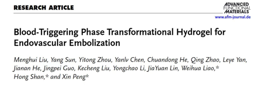 针对目前现有的商用介入栓塞剂存在生物相容性差、机械性能不稳定、血管内弥散性和铸型能力差、功能单一等问题,本团队成功研发了一种由血液触发可控相变的新型离子交联型水凝胶栓塞剂,通过一系列体外实验证实了血液中的金属离子(主要为Na+)可触发水凝胶“由软至硬”的相变,且阐明了其内在机制。随后,团队通过兔肾动脉、股动脉破裂出血以及猪肾动脉、股深动脉和奇网(类似于血管畸形)栓塞等多种动物模型,全面验证了该水凝胶的血管内栓塞的有效性和安全性。研究结果证实该新型离子交联型水凝胶具有重大临床转化价值,有望成为下一代新型液体栓塞剂,以用于良恶性实体瘤、异常增生性病变、出血性病变及血管畸形等疾病的介入治疗。