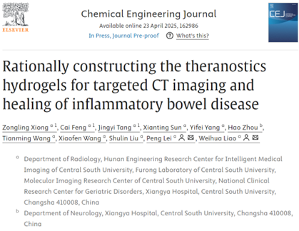 近日,中南大学湘雅医院放射科廖伟华教授团队连续在国际权威期刊发表“新型影像诊疗剂(包括对比剂和栓塞剂)”方向系列研究成果。在《Chemical Engineering Journal》(化学工程杂志)(IF = 13.4)上发表题为“Rationally constructing the theranostics hydrogels for targeted CT imaging and healing of inflammatory bowel disease”(合理构建用于炎症性肠病靶向CT成像和治疗的诊疗一体化水凝胶)的论著;在《Advanced Functional Material》(先进功能材料杂志)(IF = 18.5)发表题为“Blood-Triggering Phase Transformational Hydrogel for Endovascular Embolization”(血液触发相变的水凝胶用于血管内栓塞)的论著。