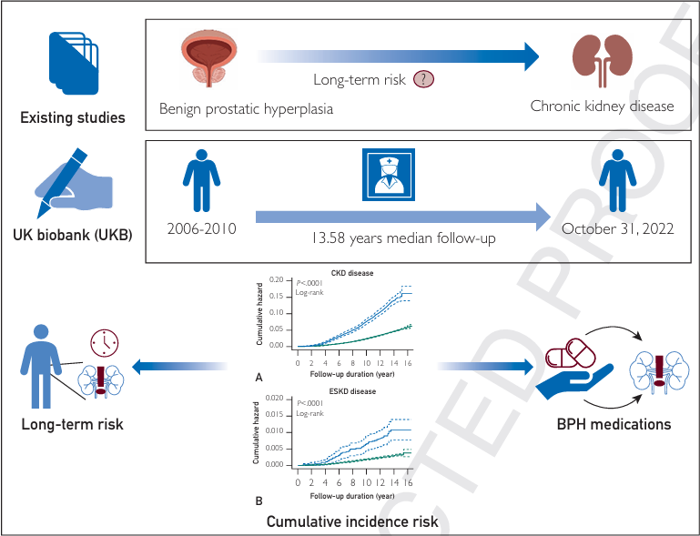 良性前列腺增生(BPH)中老年男性常见和高发疾病。目前对于BPH与慢性肾脏病(CKD)相关性的认识,主要依赖于自我报告的病例或短期效应的流行病学研究,对CKD的长期发病风险认识不足。欧美泌尿外科临床指南对于BPH患者是否应常规进行肾功能监测,以检查患者是否患有慢性肾脏病存在争议。本研究利用大样本人群研究发现患有良性前列腺增生以及服用BPH治疗药物人群患CKD的长期风险更高,并且进一步揭示BPH可能会促使CKD进展为终末期肾病(ESKD)。研究结果强调了对BPH患者进行肾功能监测的重要性。