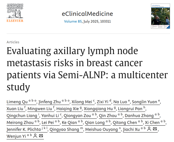 近日,中南大学湘雅二医院乳腺外科、乳腺疾病临床医学研究中心易文君教授团队在《电子临床医学》(eClinicalMedicine)(IF:10)上发表题为“通过Semi-ALNP评估乳腺癌患者腋窝淋巴结转移风险:一项多中心研究”(Evaluating axillary lymph node metastasis risks in breast cancer patients via Semi-ALNP: a multicenter study)的原创性研究论文。