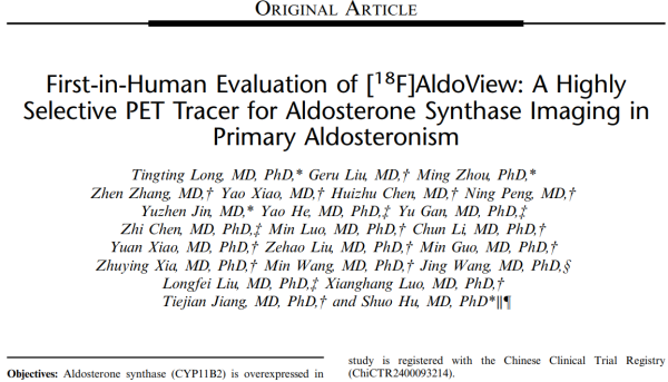 中南大学湘雅医院肾上腺疾病多学科诊疗(MDT)团队近日在核医学顶刊《Clinical Nuclear Medicine(临床核医学杂志)》(Q1, IF=10.6)发表突破性研究"First-in-Human Evaluation of [18F]AldoView: A Highly Selective PET Tracer for Aldosterone Synthase Imaging in Primary Aldosteronism(高选择性醛固酮合成酶PET示踪剂[18F]AldoView在原发性醛固酮增多症患者中的首次人体评估研究)",成功完成世界首个靶向醛固酮合成酶(CYP11B2)的高度选择性示踪剂[18F]AldoView的人体PET/CT显像研究,为解决原发性醛固酮增多症(原醛症,PA)的精准分型诊治提供创新方案。