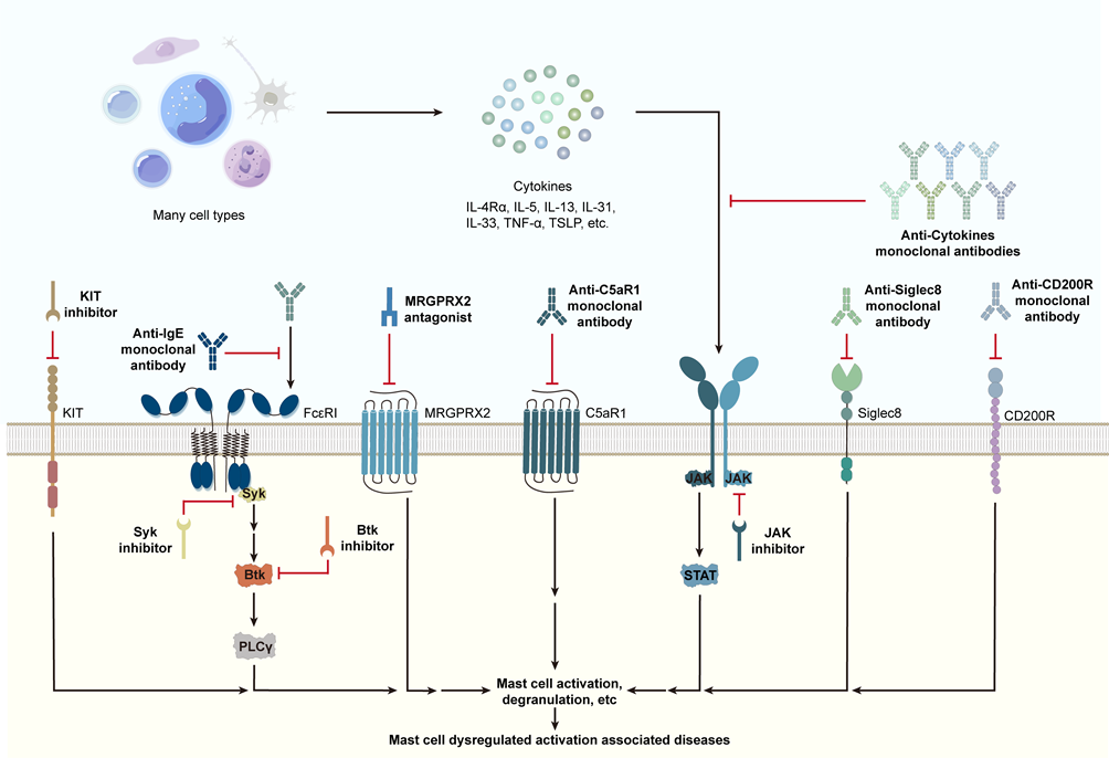 肥大细胞通过介导宿主防御和维持组织平衡在先天免疫中起着关键作用。其功能受到内环境中复杂的细胞与分子网络的精密调控。过敏原暴露或内在因素引起的肥大细胞异常激活或调节障碍会导致包括过敏性疾病与自身免疫性疾病在内的多种疾病。目前抗肥大细胞疗法已从广谱抗组胺药扩展到更精确的针对其表面与内部受体的靶向治疗。在这篇综述中,龙海教授团队探讨了肥大细胞异常活化的分子机制网络,并总结了现有与可能的靶向肥大细胞激活的干预措施。通过解析肥大细胞信号网络并联系相关疾病发生机制,为寻找新的治疗靶点提供帮助。