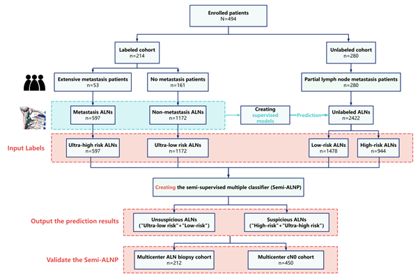 中南大学湘雅二医院易文君教授团队长期致力于乳腺癌腋窝淋巴结人工智能识别与预测模型的研究。在前期研究中,该团队已构建一个基于CT放射组学特征的无监督学习模型,初步实现了对乳腺癌患者腋窝淋巴结转移的预测。为进一步提升模型的分类性能及临床适用性,本研究在此基础上提出并构建了一种结合有标签与无标签数据的半监督多分类模型Semi-ALNP,实现了对腋窝淋巴结转移风险的精准分级。