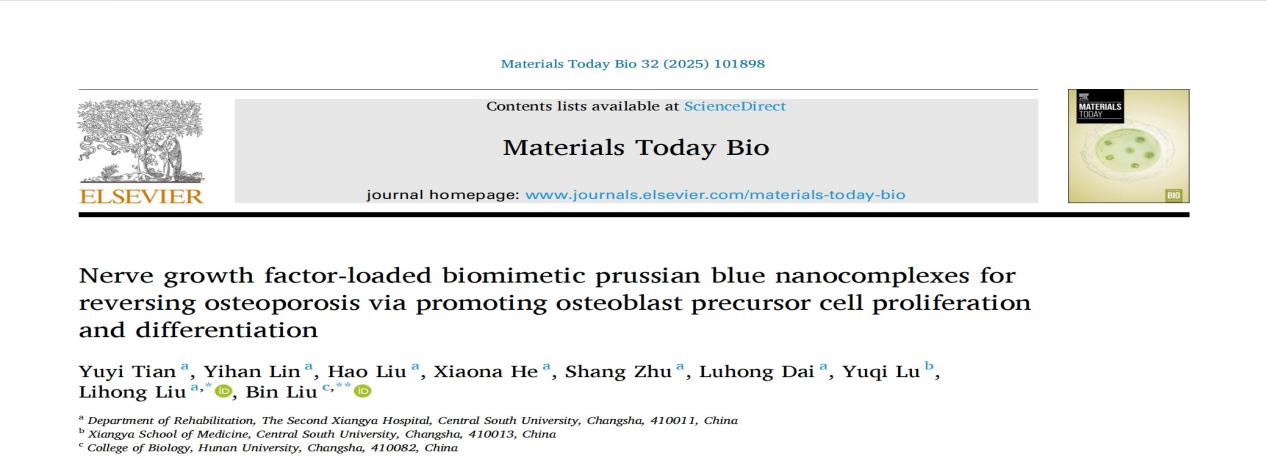 近日,中南大学湘雅二医院康复医学科刘立宏团队在国际著名期刊《Materials Today Bio》(中科院1区,IF 10.2)上发表了题为《Nerve growth factor-loaded biomimetic prussian blue nanocomplexes for reversing osteoporosis via promoting osteoblast precursor cell proliferation