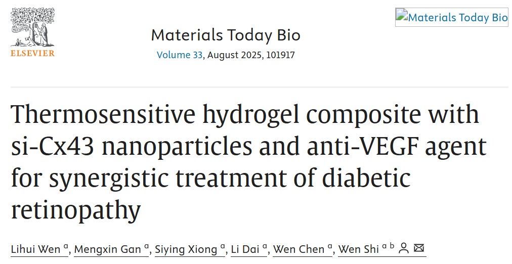 近日,中南大学湘雅二医院眼科施雯团队在国际权威期刊《Materials Today Bio》(中科院一区,IF=10.2)发表题为《Thermosensitive hydrogel composite with si-Cx43 nanoparticles and anti-VEGF agent for synergistic treatment of diabetic retinopathy》的研究论文。该研究创新性地开发了一种负载si-Cx43纳米颗粒与抗VEGF药物的温敏水凝胶复合系统,为糖尿病视网膜病变(DR)的治疗提供了可能的突破性解决方案。