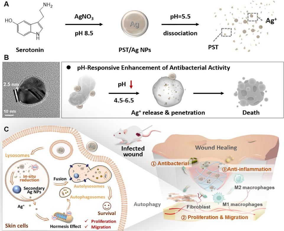 研究以5-羟色胺(serotonin, 5-HT)为原料,利用其在碱性条件下的自氧化聚合能力原位还原银离子,合成包覆有聚羟色胺(PST)壳层的银纳米颗粒。该壳层在感染部位的弱酸性环境下快速降解,释放Ag⁺,从而增强局部抗菌活性;而在正常细胞微环境中则稳定存在,减少Ag⁺泄露,显著降低细胞毒性。该研究首创pH响应型核壳纳米银(PST/Ag),通过"辨微环境而施治"的智能策略,实现了"精准抗菌-微环境重编程-自噬激活"的多级协同治疗,为复杂感染创面提供了突破性解决方案。
